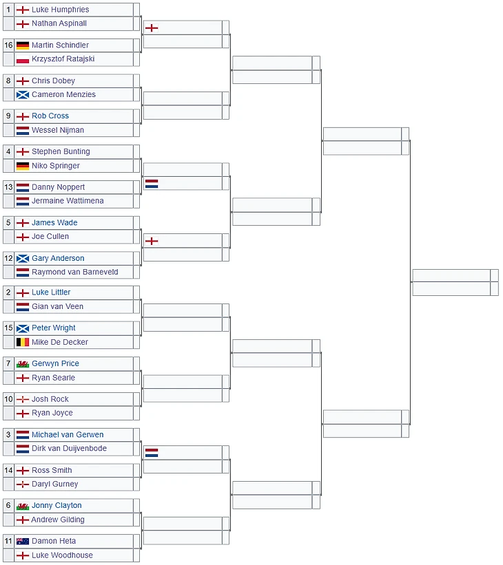 чемпионы мира PDC - англичане Люк Хамфрис (2024-й год, лидер общего рейтинга), Люк Литтлер (2025-й год, действующий победитель PDC World Darts Championship) и Роб Кросс (2019-й год), шотландцы Гэри Андерсон (2015-й, 2016-й годы) и Питер Райт (2020-й, 2022-й годы), Майкл ван Гервен (2014-й, 2017-й, 2018-й годы) из Нидерландов и валлиец Гервин Прайс (2021-й год),