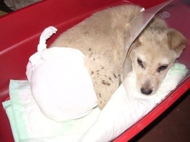 Собака Джуля. Эту несчастную животину сбила машина, и у неё была обнаружена в лапе пуля.