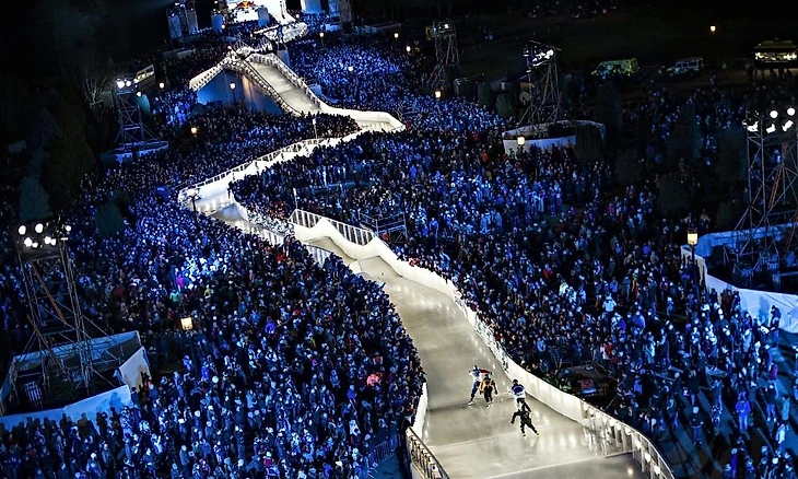 Red Bull Crashed Ice – это чемпионат мира. Специально построенные трассы в центре города. Большие основательные фигуры из металлоконструкций. Лёд хорошего качества, потому что есть система охлаждения. Очень высокий уровень организации. Red Bull этим отличается. Я участвовал во многих роллерских первенствах, медалей 30 у меня висит, судя по охапке. Так вот по организации, роллерские заезды просто отдыхают.