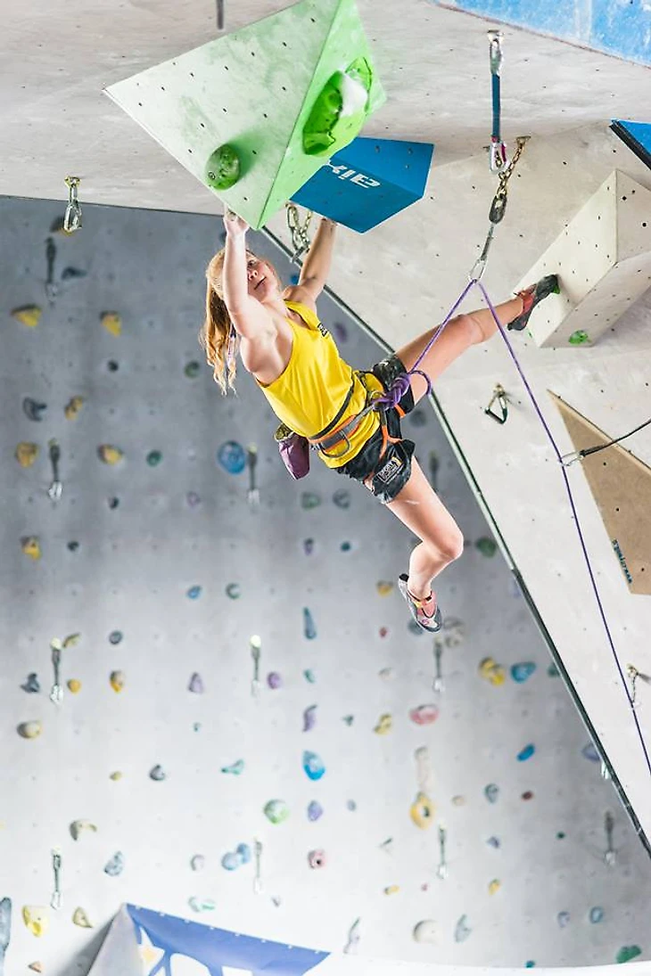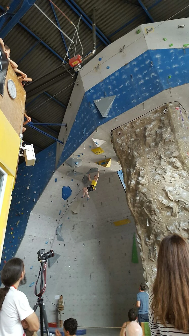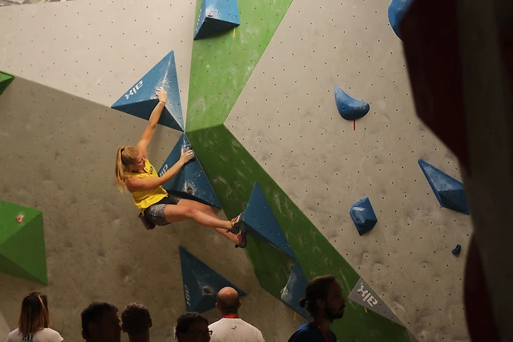 Началось всё с боулдеринга. Как на юношеских первенствах мира - 8 трасс в квалификации. Я не особо была готова к такому, но от взгляда на трассы у меня не включился мой уже привычный "нервяк" - я чувствовала себя спокойно. Благодаря этому довольно быстро "топнула" с первой попытки 5 трасс из 8-ми. После короткой передышки, встретившись взглядами с моей группой поддержки, отправилась добивать оставшиеся 3 сложные. И даже как-то умудрилась их добить за остававшиеся полчаса, сорвавшись только разок. Промежуточное 2-е место - 8 "топов" с 9-ю попытками. Первой стала Фанни Жибер (Fanny Gibert) из Франции. После полного для меня грусти и разочарования чемпионата Великобритании (British Bouldering Championship - прим. Рваного скальника) всего неделей ранее, ко мне будто вновь вернулись воодушевление и окрыление. По-моему, это мой лучший результат на соревах!