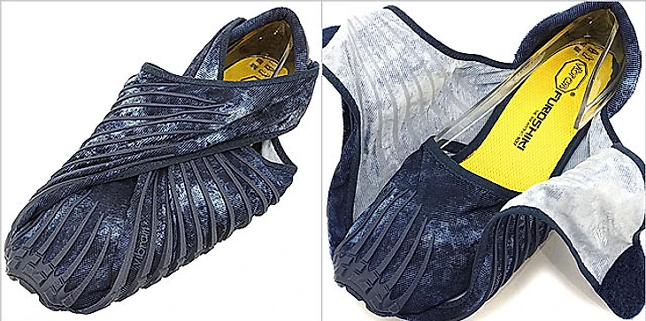 Пожалуй, самая безумная позиция обзора. Японские кроссовки-«обмотки» Furoshiki представляют собой крепкую подошву от Vibram с двумя лёгкими бортами-лентами, покрывающими верхнюю часть стопы внахлёст. Ленты крепко, но вместе с тем деликатно удерживают стопу. Стопа дышит – «перепончатая» структура бортов это предусматривает.