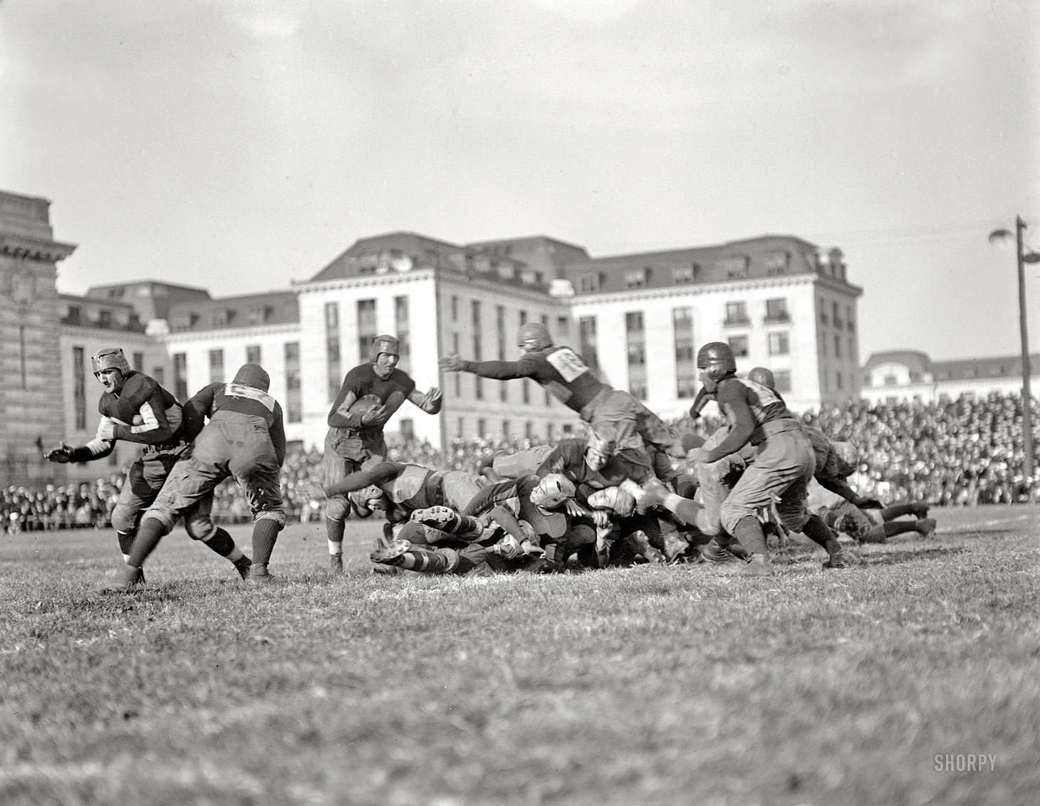Это 1920 год, профессиональная лига. Но команды установить не удается. Опять же отсутствие формы стерло различие между игроками. Но на них уже появилась защита. Шлемы из кожи, защитные накладки на коленях и корпусе. Посмотрите на подошвы бутс — это острые опасные шипы.
