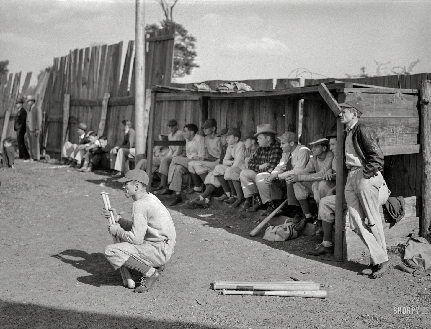 На фото апрель 1939 года, Сент-Огастин, Техас (кстати, старейший из ныне существующих городов США). Вторая мировая еще не началась и это матч между командами из разных корпусов военного училища. Как видите, «дагауты» еще не были в ходу. Запасные сидят в деревянной будке, а те, что не влезли — на кортах. Зрителям также не выказывалось должного пиетета, и они располагались вдоль заборов за линией аута.