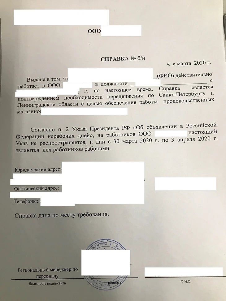 Лучше позаботиться об этом заранее, чтобы у сотрудников правоохранительных органов (МВД, Росгвардии и других патрулирующих) не возникло к вам вопросов и претензий. Также в справке лучше указать данные о личном автотранспорте, если вы добираетесь на нем до работы.