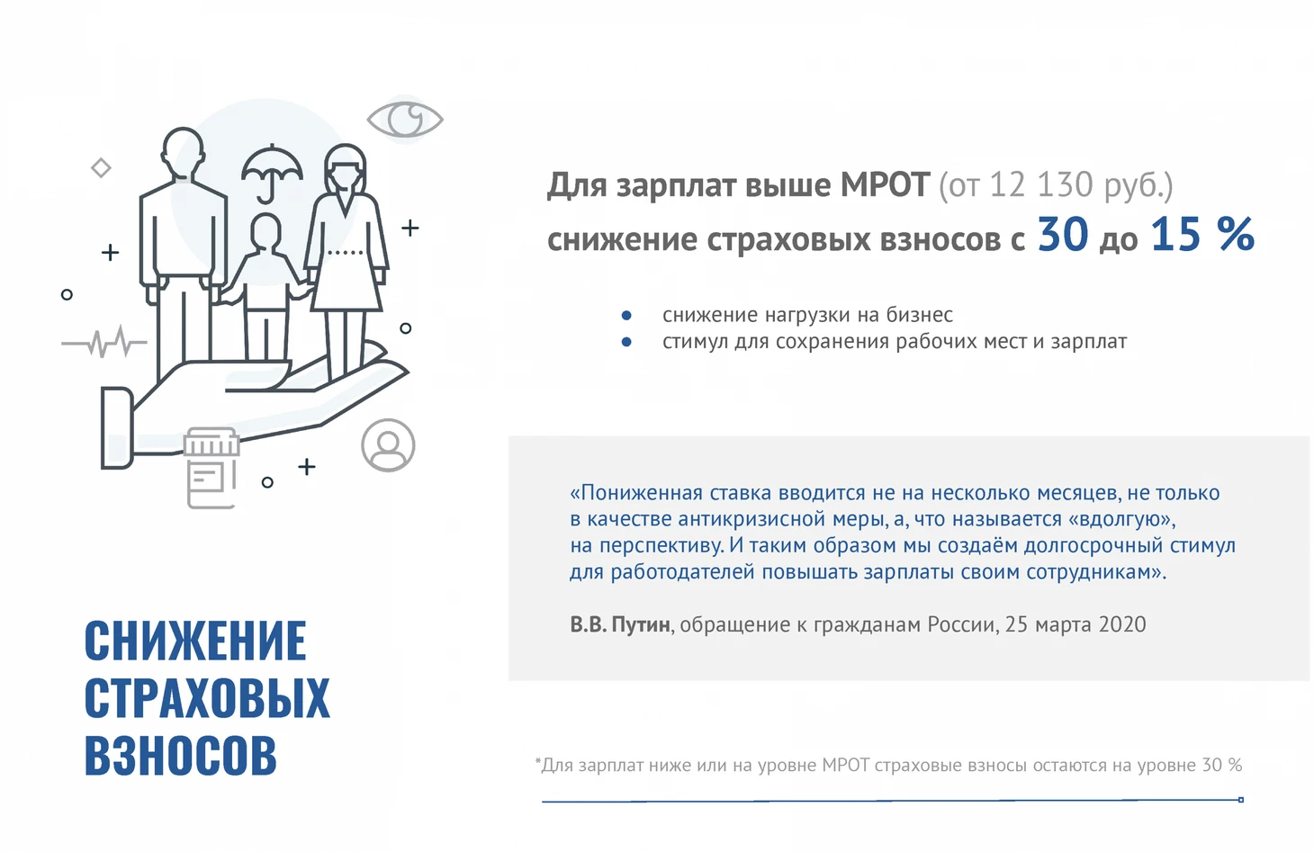 - Страховые взносы снижены до уровня 15% в случае, если зарплата сотрудников выше установленного МРОТ, в ином случае ставка не меняется;