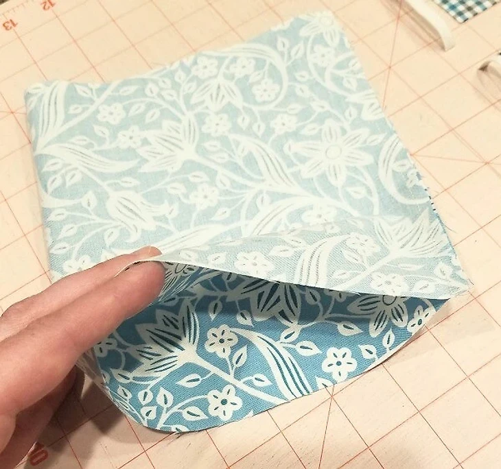 Основную деталь сложите пополам лицевой стороной внутрь. Сшейте по стороне длиной 20 см, оставив припуск 0,7 см.
