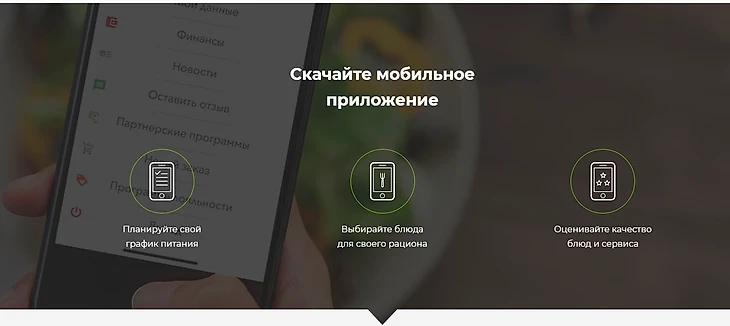 Главная страница выглядит как обычный сайт доставки – вас встречает крупный блок с говорящей надписью “Акция!”, который предлагает день пробного питания по скидке. Пролистав чуть ниже, можно увидеть различные программы для похудения и поддержания формы. Каждое блюдо в рационе имеет уже рассчитанные БЖУ и калории – удобно для спортсменов и людей, сидящих на диете.
