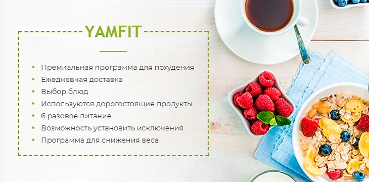 Меню Yamfit – вариант для тех, кто хочет значительно снизить вес. Позиционируется как премиальная программа для похудения, в которой используются дорогостоящие продукты. Один день питания обойдется в 1800 рублей.