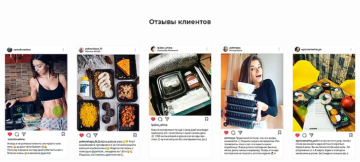Внизу есть отдельный блок с отзывами. Инстаграмы реальных людей, которые положительно высказываются о доставке, рационах и впечатлениях.