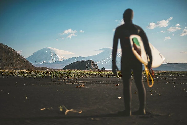 А ближайшее открытое доступное место – Халактырский пляж, длинная коса с черным песком. Традиционно туда приезжали местные жарить шашлыки. Когда начал развиваться серфинг, благодаря местным деятелем вроде Антона Морозова, пляж начал светиться в серффотографиях и в серфвидео, в том числе зарубежных. Потому что он эстетически красив: напротив находятся вулканы – Козельский и Авачинский, по бокам – горы. Выразительно и красиво. Поэтому он стал культовым и знаменитым. Плюс на Камчатке в целом хороший серф: океанская волна с большим периодом (интервал времени между прохождением двух смежных вершин волн – Sports.ru), образуются песчаные банки (мель в океане, глубина над которой значительно меньше окружающих глубин – Sports.ru) и хорошие пики вырастают.