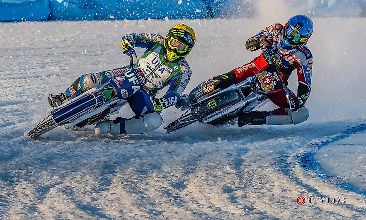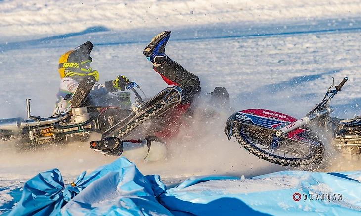 100-120 килограммовые мотоциклы, на каждом из них по 200 с лишним стальных шипов. Шипы по 28 мм( практически 3 сантиметра). Малейшая ошибка гонщика, может привести к серьёзному падению. От заезда к заезду лёд становится всё более и более изрытым, что тоже не даёт лишней гарантии безопасности.