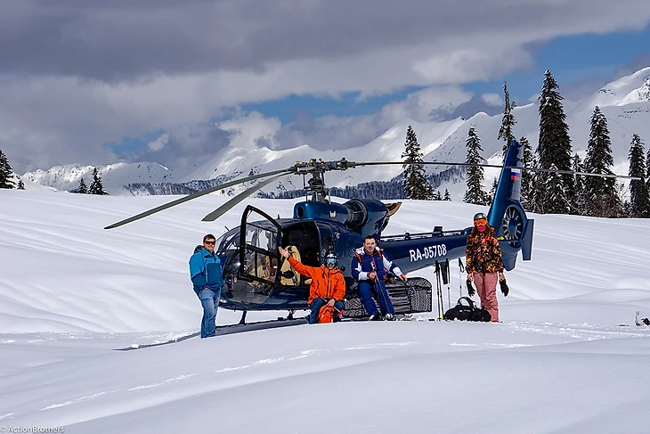 Всё запомнили, потренировались, сели... пилот запускает двигатель вертолета и лопасти начинают свое движение, скорость их вращения увеличивается, мы отрываемся от земли и летим… а через 10 минут уже вертолет садится на гребне горы Чолгон, на высоте 2650 м. Гид открывает дверь и мы поочередно осторожно высаживаемся, но не прыгая как в фильмах или ролике Соболева о прыжке с вертолета, а буквально сползаем вниз на снег и ждем следующие указания гида! Скорость происходящего создало ощущение телепортации - будто синий вертолет Gazelle доставил нас в другой мир, в Республику Фрирайда в котором мы были отрезаны от реальности в окружении снежных горных массивов. Пилот заглушил двигатель. Вокруг тишина, спокойствие, горные массивы, скалы, кулуары, карнизы с одной стороны, с другой – бескрайнее Чёрное море с переливающимся отражением утреннего солнца…
