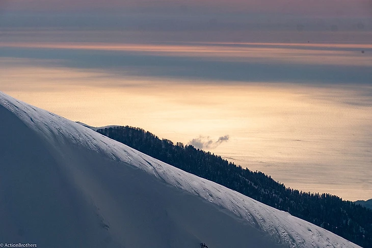 По форме вся скала – очертание огромного динозавра. Будто он лег много лет назад на это место и уснул… а сейчас только изредка его покой нарушает шум лопостей вертолета Heli Abkhazia. Мы посозерцали виды, засняли их на коптер и поехали по следующему фрирайд маршруту. И снова началась сказка… разлетающийся снежный пух, такой воздушный легкий, скорость в невесомости. Следующие маршруты были другими, каждый раз сложнее и интереснее! Ведь гид уже знал наш уровень катания и подбирал подходящие маршруты. Можете себе представить - протяженность таких удовольствий более 5 км и все они первым следом!
