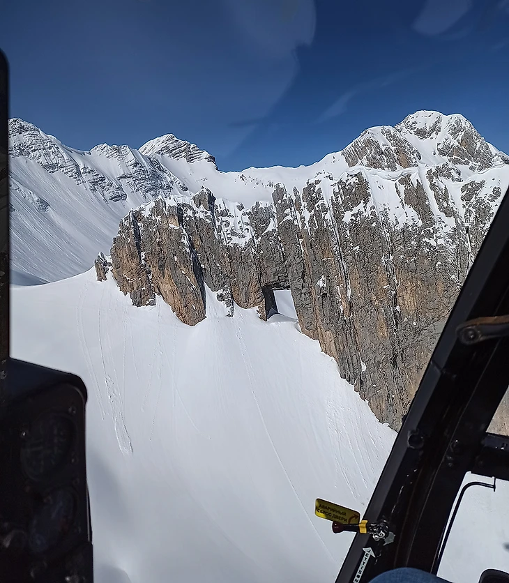 Впереди долгожданные спуски, адреналин начинает зашкаливать. Гид подобрал под нашу группу первый разминочный маршрут, с вертикальным перепадом более 1000 м, но с легким рельефом, дал указания и показал линию спуска и точку остановки. Дальше все как в мечте фрирайдера! Легкий снежный пух искрился и буквально взрывался под сноубордом. Это был серфинг по снегу, ощущение парящего движения. Внизу нас подхватил тот самый волшебный синий вертолет и мы полетели на следующую вершину. Мы высадились, проехали 200 метров траверсом до удивительного места в отдельно возвышающейся скале под названием Глаз Дракона, арка – с правильной геометрией, созданная природой и временем.