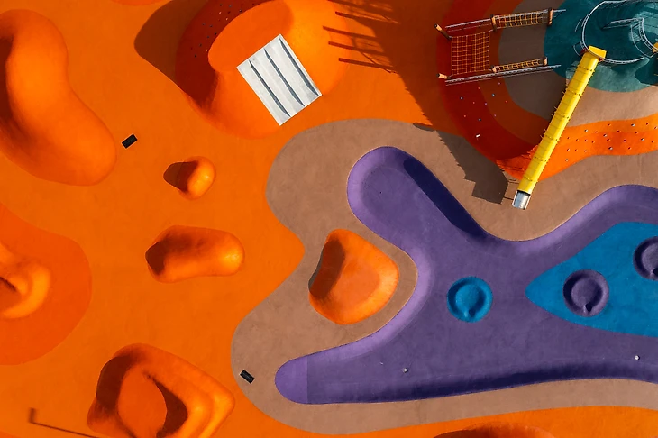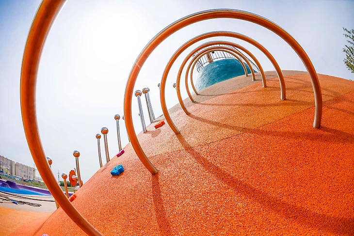 В парке на бульваре Щипакина собраны разные участки России, и детская зона была назначена Камчаткой. Наша задача была сделать что-то, напоминающее вулканы, гейзеры, сопки и другие объекты в этой стилистике. В итоге мы создали нелинейное пространство с целой россыпью разных форм, на склонах которых все желающие могут кувыркаться, скатываться с горок, прыгать внутри кратеров-батутов, но главное – придумывать свою игру.