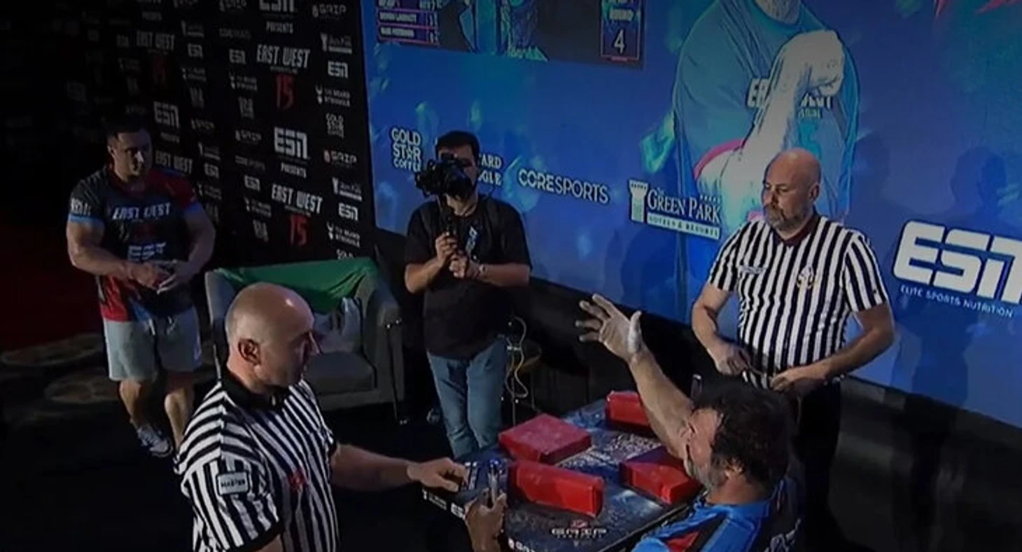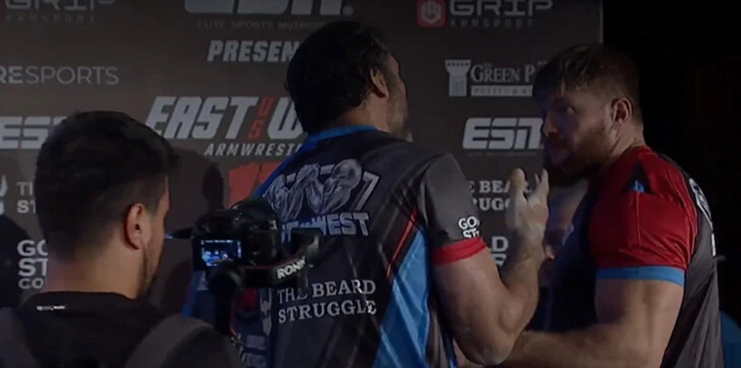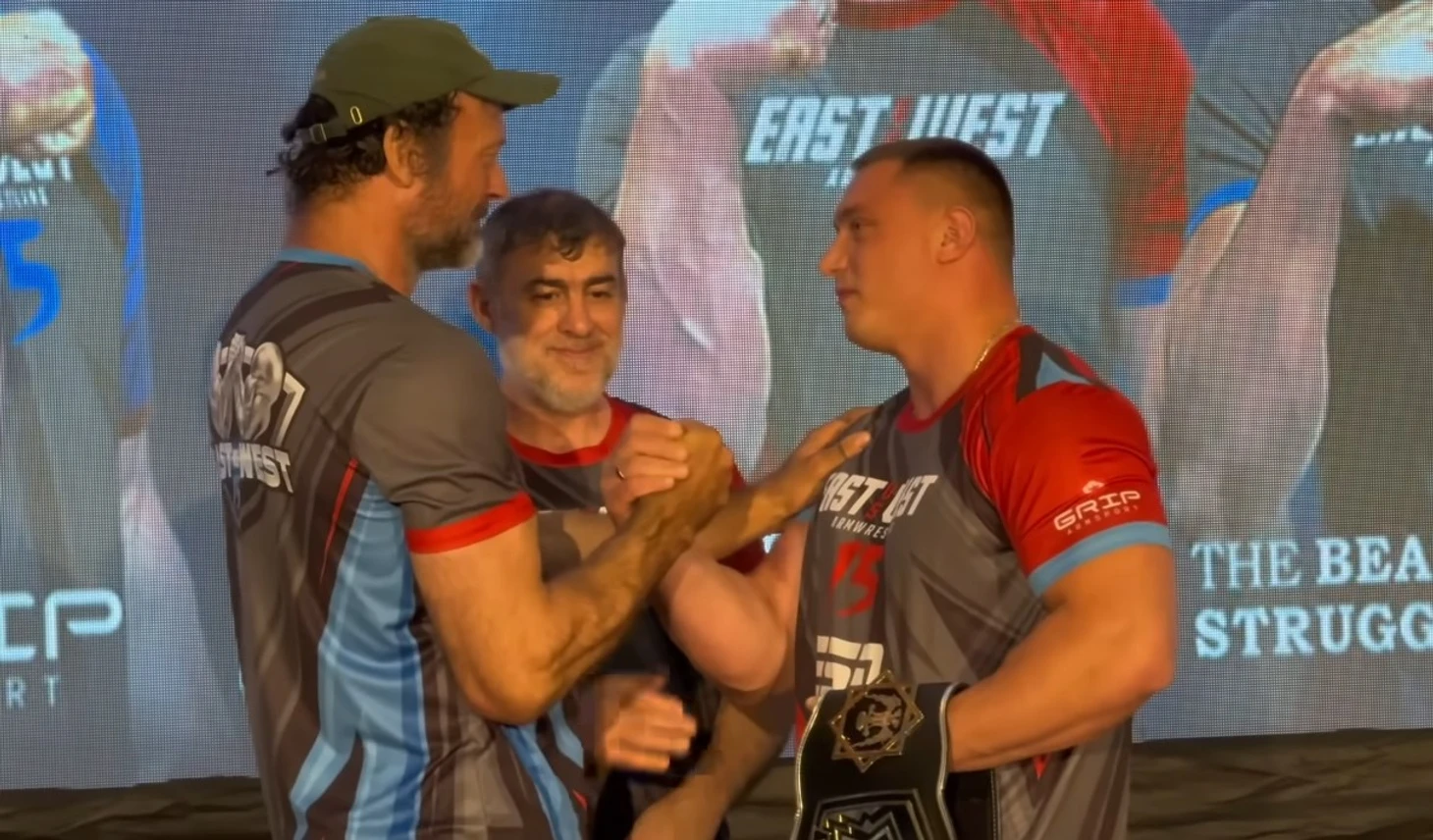 Тот приехал на East vs West 15 в качестве приглашенного гостя, а канадец призывал нашего армрестлера вернуть трофей «Молот наследия» (из-за редкого участия в соревнованиях).