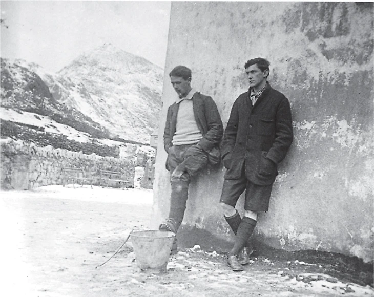 Пен-и-Пасс, Сноудония, декабрь 1913 года. Зигфрид Херфорд, известный скалолаз, и Джордж Мэллори. Фотография Джеффри Уинтропа Янга.