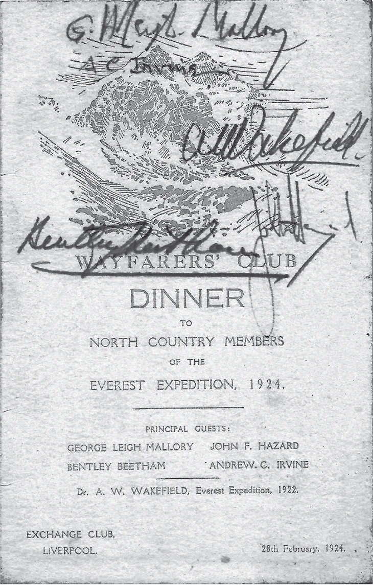 Карточка с меню ужина, устроенного клубом «Путники» в честь команды Эвереста и А. У. Уэйкфилда, участника экспедиции на Эверест в 1922 году. Мэллори и Ирвин подписали свои имена вверху.