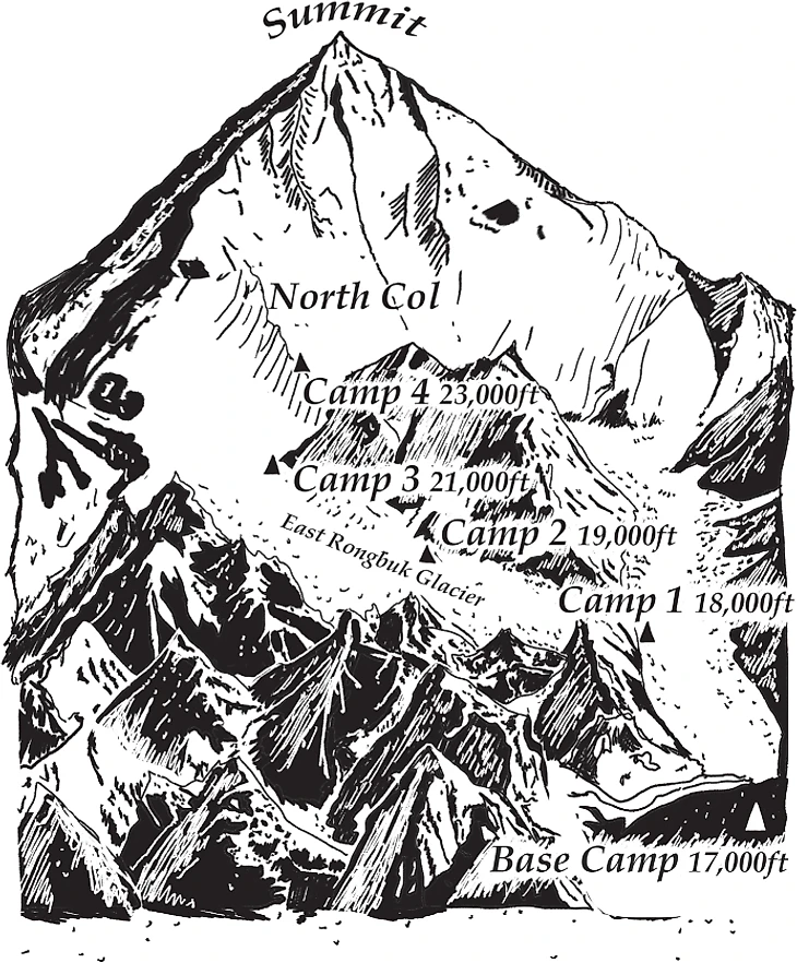 Единственное, что они могли контролировать, или на что они надеялись, это логистика доставки всех припасов на Северное седло. Ни один носильщик не смог бы пронести груз все 19 километров от базового лагеря на высоте 5 121 до третьего лагеря, их передовой базы — на 1128 метра выше, у подножия Северного седла — поэтому план состоял в том, чтобы установить два промежуточных лагеря, на тех же местах, которые использовались в 1922 году, и доставлять все поэтапно.