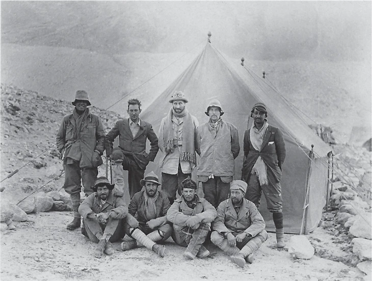 Май 1924 года, ледник Ронгбук. Третья британская команда на Эверест: (задний ряд, слева направо) Ирвин, Мэллори, Нортон, Оделл и Макдональд; (передний ряд) Шеббир, Брюс, Сомервелл и Битхэм.