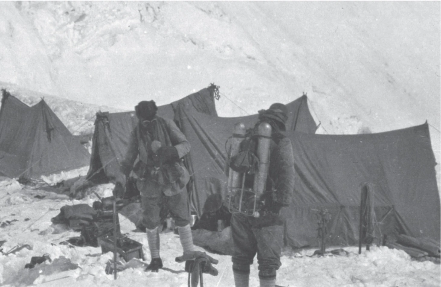 Вот только... все было не совсем так. Захваченный Оделлом «снимок» момента их отъезда раскрывает иную правду. Это немного необычный, необычайно откровенный момент из экспедиции, где и было сделано большинство снимков. Ирвин справа, собирается уходить, а Мэллори слева, возится с чем-то на своем кислородном аппарате. Нет ни лучезарных улыбок, ни решительных челюстей, ни флагов, ни вымпелов, кажется, что в лагере больше никого нет. Нортон, руководитель экспедиции, все еще торчит в своей палатке, ослепнув, и шерпов нигде не видно.