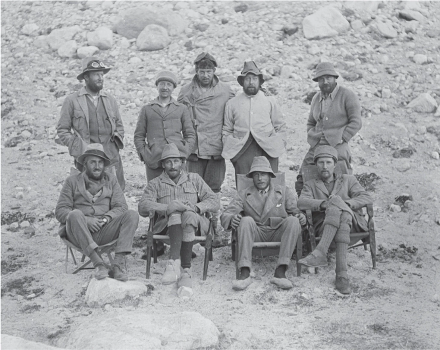 Июнь 1924 года, базовый лагерь на леднике Ронгбук. Выжившие члены третьей британской экспедиции на Эверест: (вверху, слева направо) Хазард, Хингстон, Сомервелл, Битхэм и Шеббир; (внизу) Брюс, Нортон, неизвестный мужчина и Оделл.