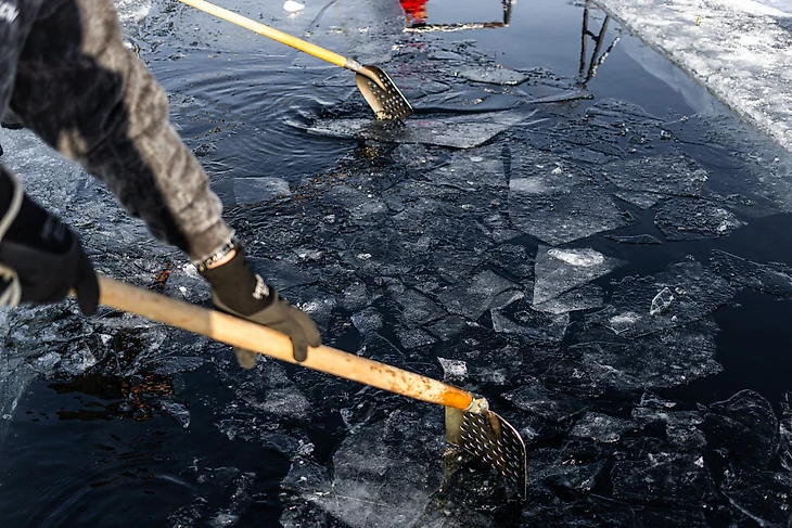 Чтобы оборудовать на озере все для фридайвинга, необходимо сделать несколько майн – больших прорубей. Для этого пользуются бензопилами. Но ночью майны снова затягивало тонким слоем льда – и каждое утро начиналось с подготовки воды.