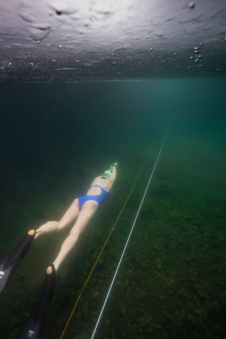 Главный рекорд в этот раз неглубинный: Екатерина Некрасова проплыла 122 метра в ластах подо льдом. Подготовка к длине отличается от погружений в глубину. Для рекордного заплыва подготовили отдельную трассу рядом с берегом.