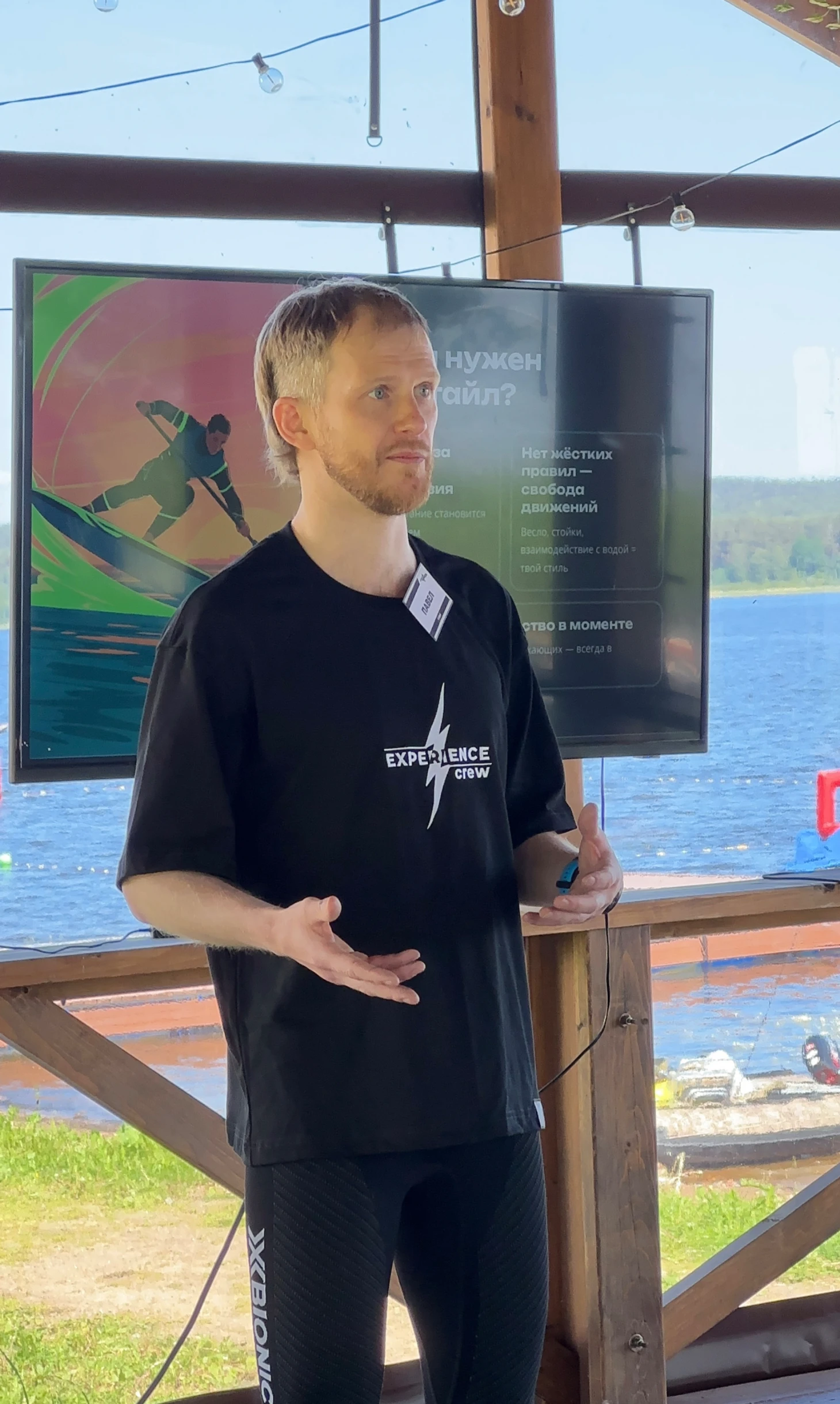 Вводную лекцию провел Павел Кочанов. Павел развивает фристайл в России и является уже мировым лицом этой дисциплины. Он признанный мастер. У него в соцсетях уже более 15 млн просмотров на видео с тренировок и выступлений, приглашения на фестивали на Сардинии, в Японии, американская фирма по продаже САП-досок на Amazon предлагает сотрудничество. В комментариях в аккаунтах Павла его нарекли «River Master», пишут, что он «легенда».