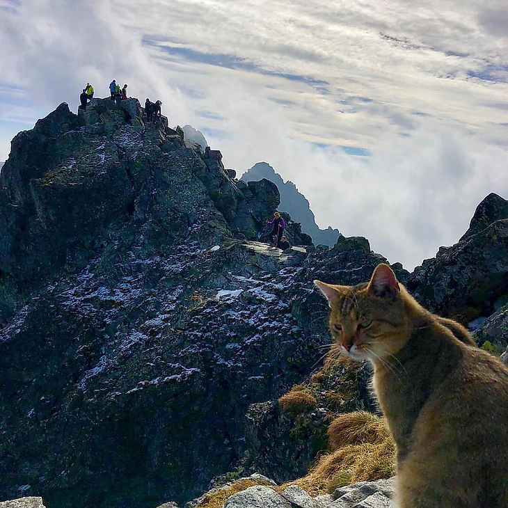 Вот необычная история от альпиниста Войцеха Ябчинского: в 2018-м он с другими туристами взбирался на пик Рысы, высочайший в Польше (2500 м), а на самой вершине встретил... одинокого кота, вылизывающего лапы.