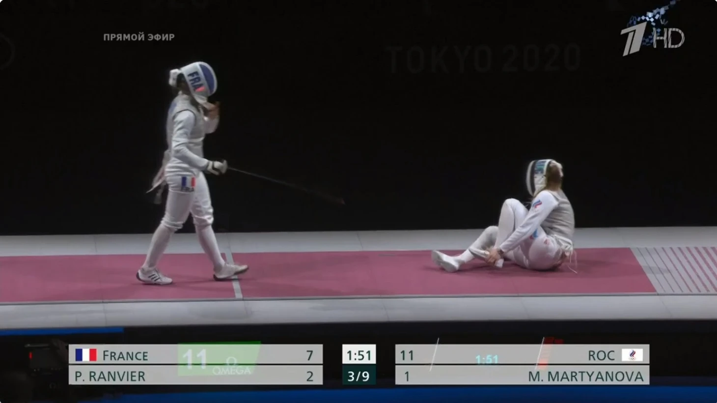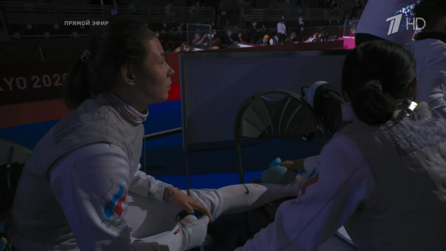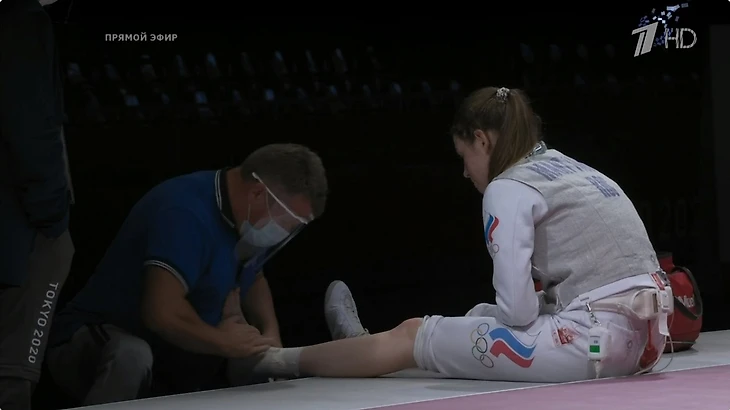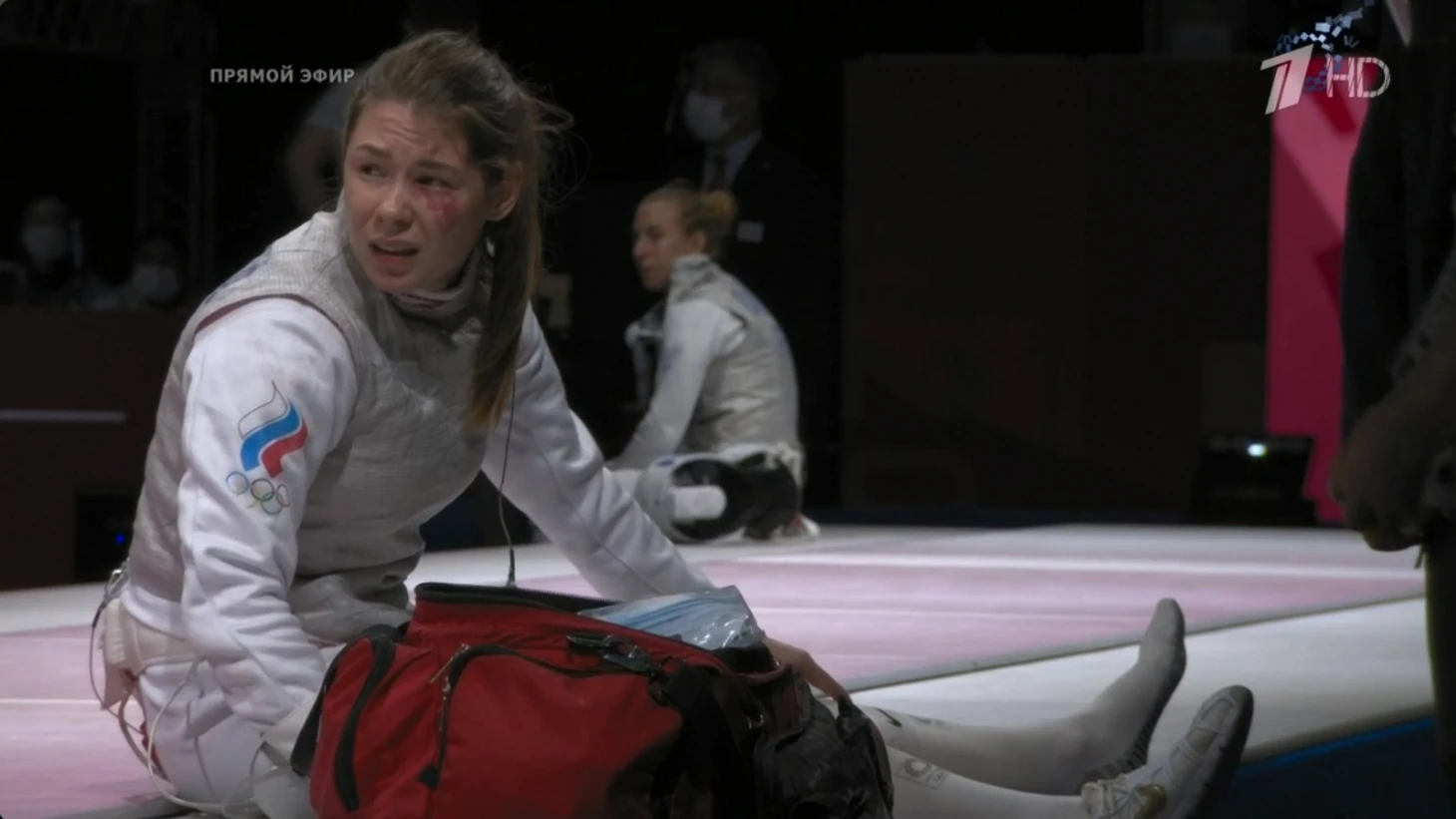 На ее лице сразу отразилась гримаса боли, а оператор стал ловить лица российских рапиристок и тренера.