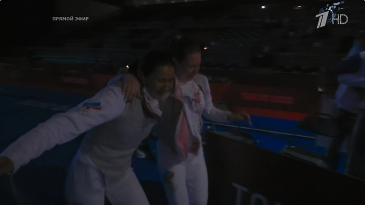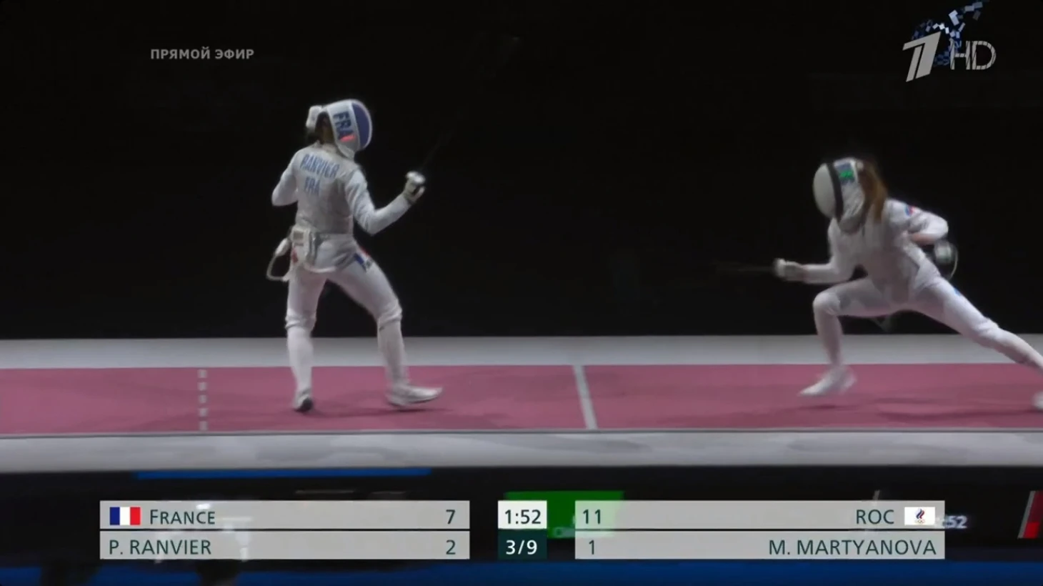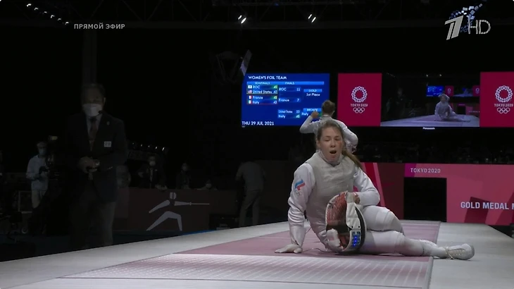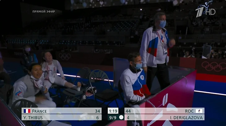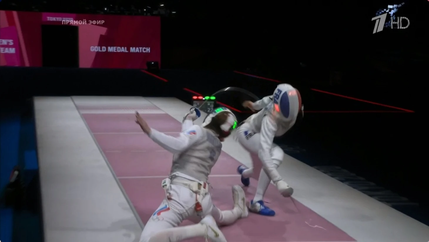 На ее лице сразу отразилась гримаса боли, а оператор стал ловить лица российских рапиристок и тренера.
