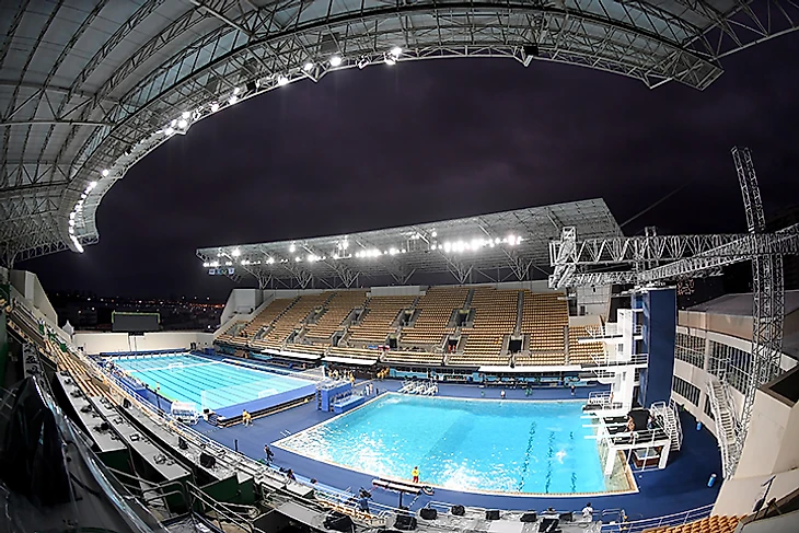 Водный центр имени Марии Ленк – первой женщины-латиноамериканки, принявшей участие в Олимпийских играх. Тут будут порхать синхронистки, плюхаться в воду прыгуны и хватать друг друга за трусы ватерполисты.