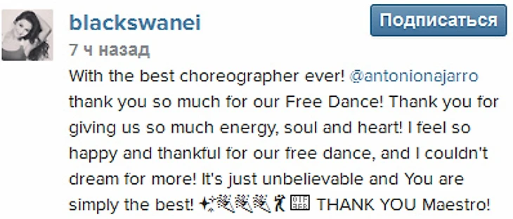 «С самым лучшим хореографом! Большое спасибо Антонио Нахарро за наш произвольный танец», – написала Ильиных.