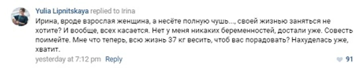 «Нет у меня никаких беременностей, достали уже. Совесть имейте. Мне что теперь всю жизнь 37 кг весить, чтоб вас порадовать? Нахуделась уже, хватит», – написала Липницкая в комментариях под обсуждением ее фотографий с получения квартиры в Москве.