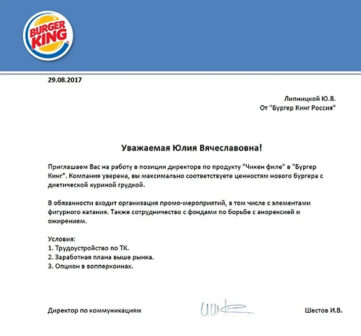 «Уважаемая Юлия Вячеславовна! Приглашаем Вас на работу в позиции директора по продукту «Чикен филе» в «Бургер Кинг».