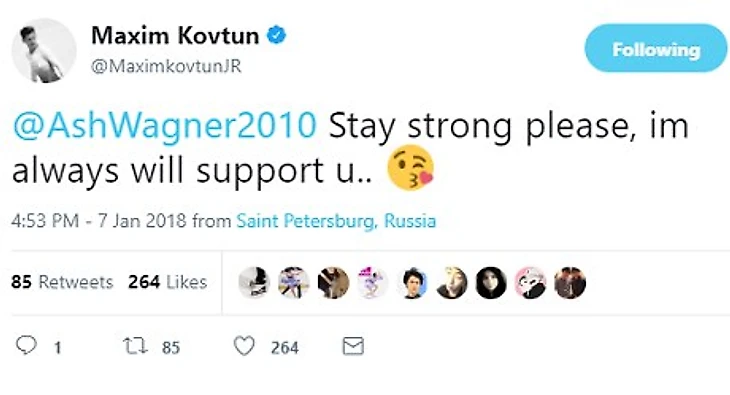 Российский фигурист Максим Ковтун выразил поддержку представительнице США Эшли Вагнер, которая не сумела попасть в состав своей национальной сборной для участия в Олимпийских играх в Пхенчхане.