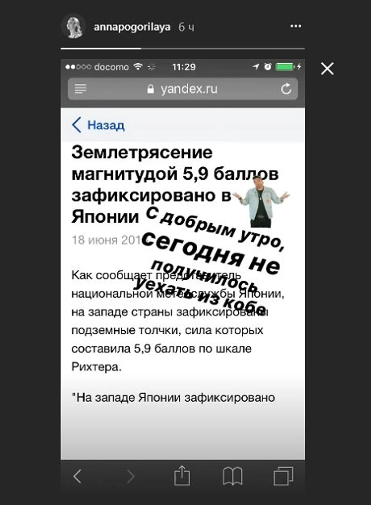 «С добрым утром, сегодня не получилось уехать из Кобе», – написала Погорилая.