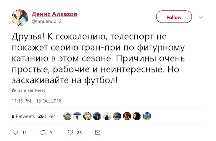«Друзья! К сожалению, «Телеспорт» не покажет серию Гран-при по фигурному катанию в этом сезоне. Причины очень простые, рабочие и неинтересные. Но заскакивайте на футбол!» – написал Алхазов в твиттере.
