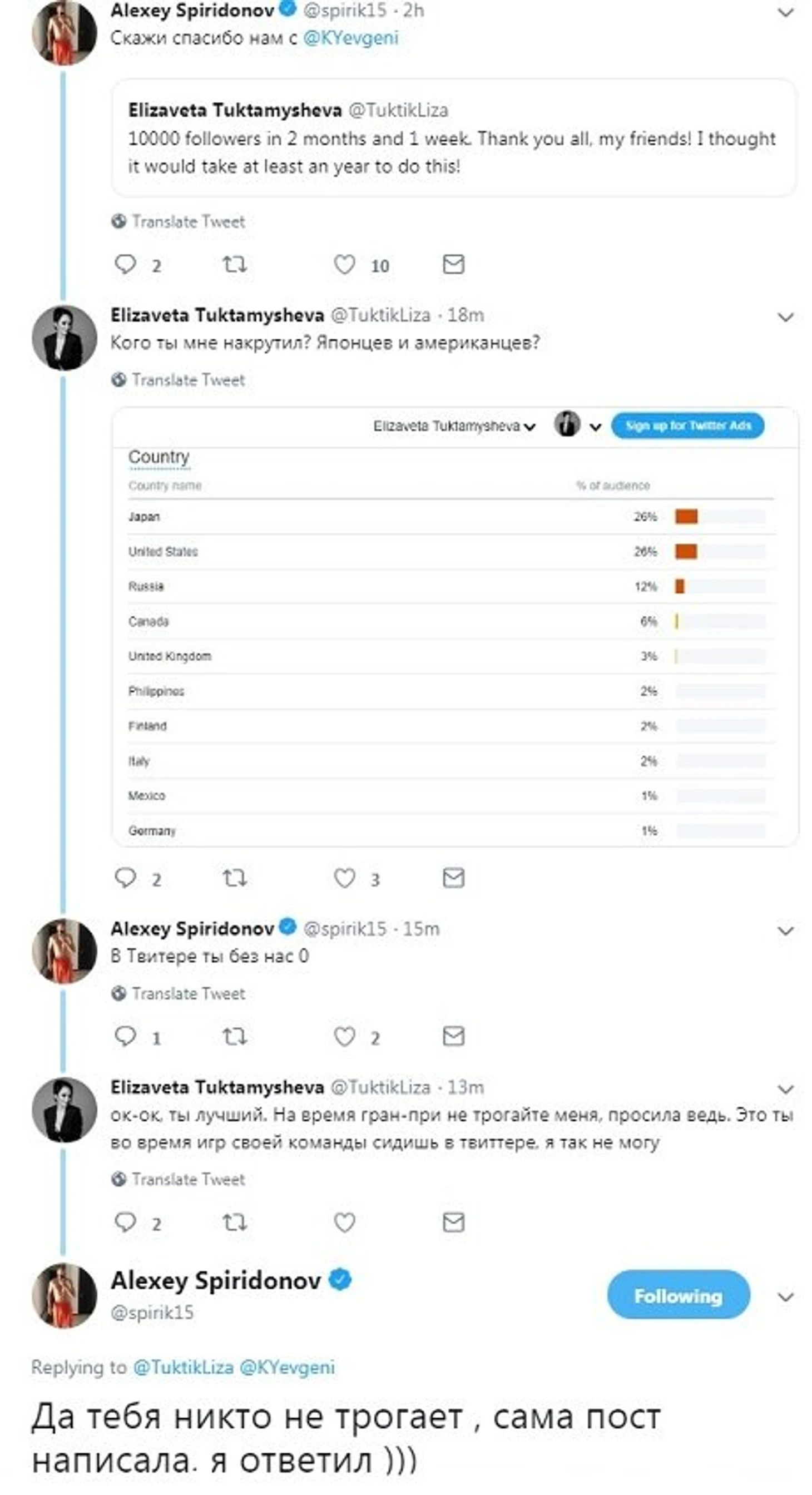 Туктамышева написала, что за последние два месяца на нее в твиттере подписались 10 тысяч человек. Спиридонов тут же сообщил, что это благодаря ему и бывшему теннисисту Евгению Кафельникову, с которыми фигуристка периодически общалась в твиттере.