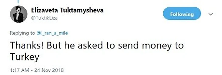 Позднее этот пост был удален, однако остался ответ в твиттере о том, что от фигуристки требуют перевести деньги в Турцию.