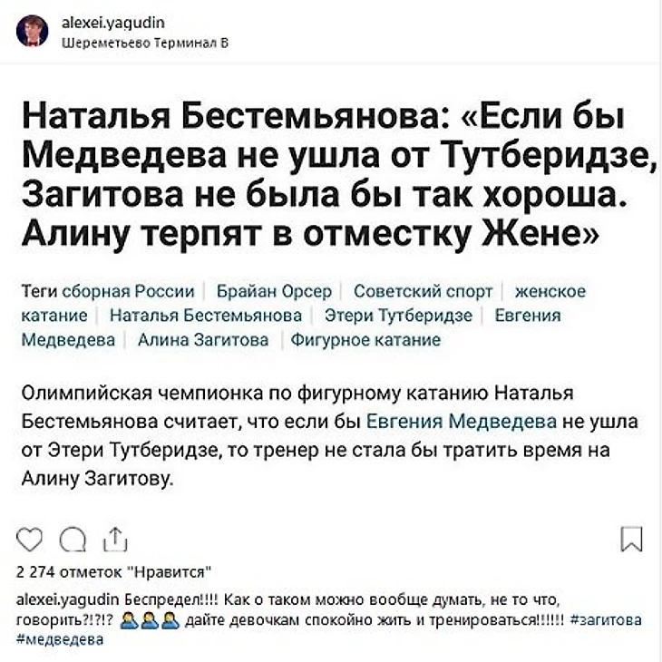 «Беспредел! Как о таком можно вообще думать, не то что говорить! Дайте девочкам спокойно жить и тренироваться», – написал Ягудин.