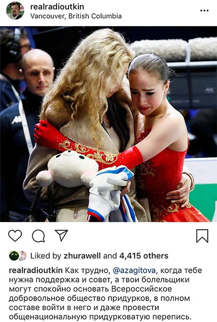 Спортивный комментатор Василий Уткин разместил в инстаграме фотографию олимпийской чемпионки Алины Загитовой и сопроводил ее следующей подписью: