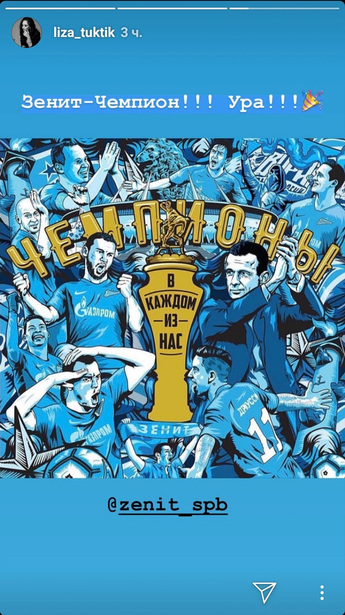 6. Елизавета Туктамышева поздравила ФК «Зенит» с победой в чемпионате России.