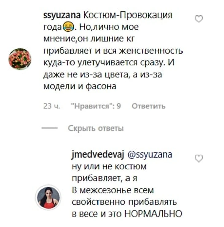 «Ну или не костюм прибавляет, а я. В межсезонье всем свойственно прибавлять в весе, и это нормально», – написала спортсменка.