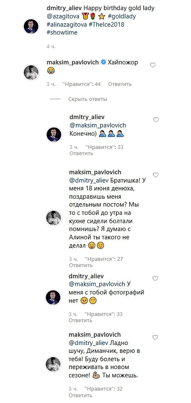 Российский фигурист Дмитрий Алиев поздравил олимпийскую чемпионку Алину Загитову с днем рождения.