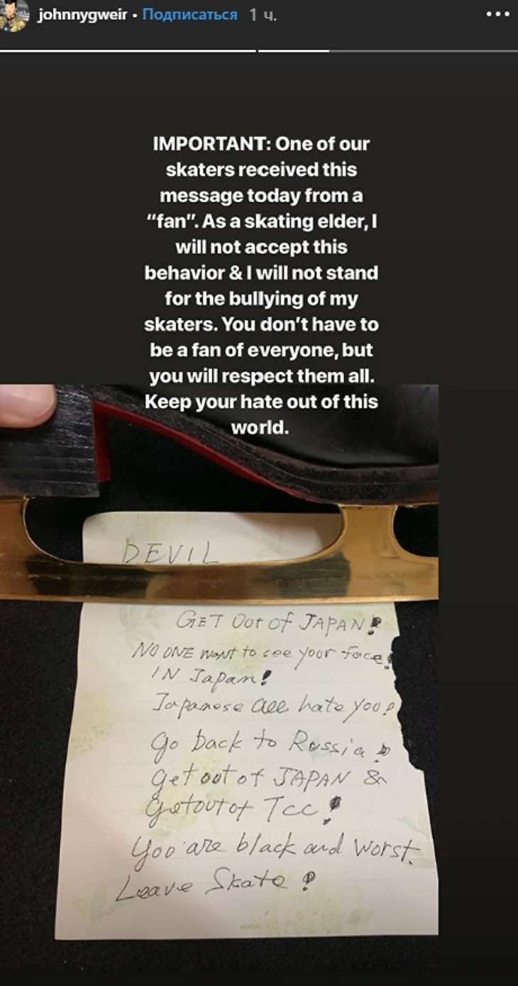 Американский фигурист Джонни Вейр сообщил, что один из участников шоу Fantasy on Ice, которое проходит в Японии, получил анонимное послание с призывом покинуть страну.