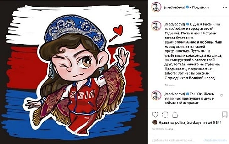 Медведева выложила в инстаграм поздравление с Днем России. На картинке были перепутаны цвета флага