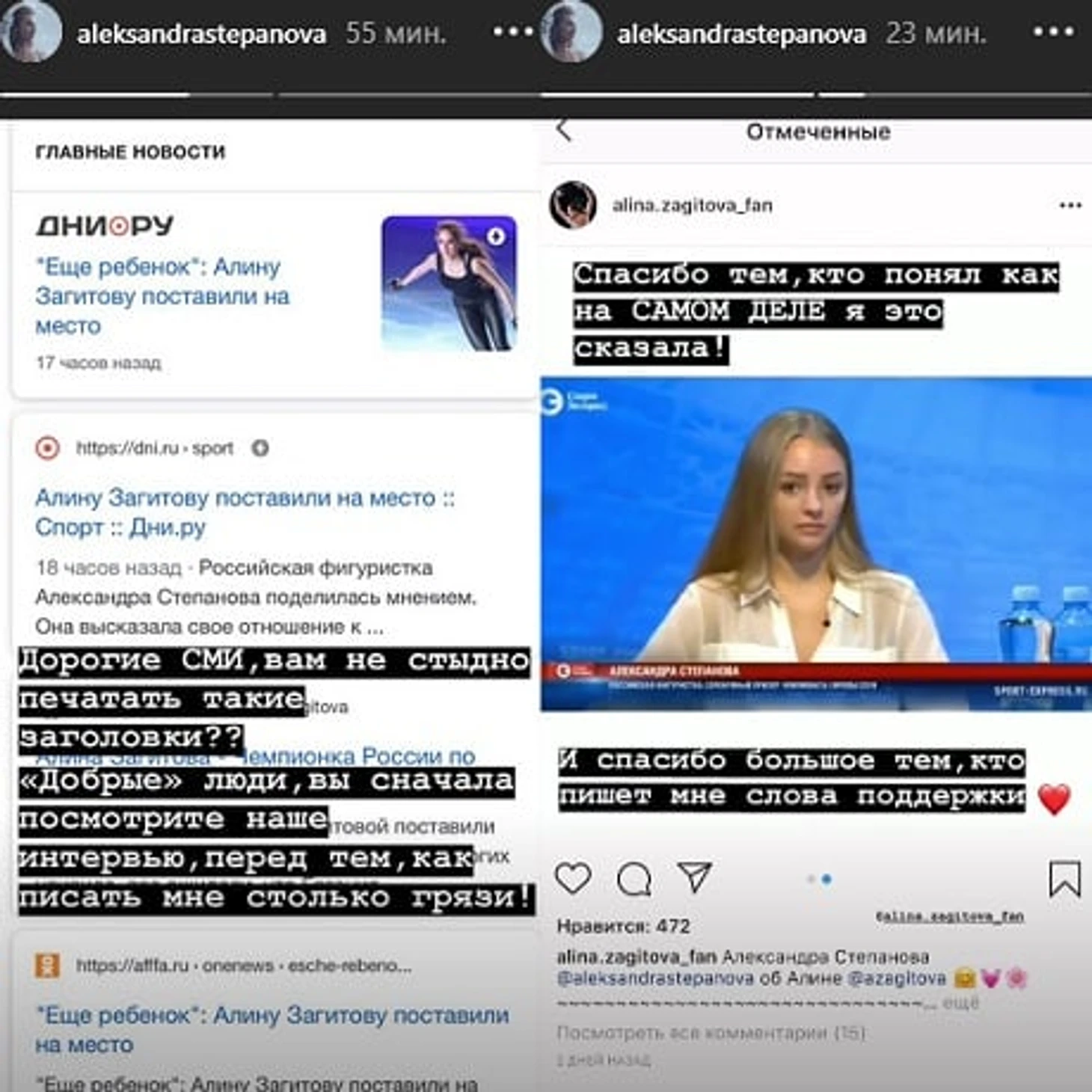 Российская фигуристка Александра Степанова, выступающая в танцевальном дуэте с Иваном Букиным, заявила, что некоторые СМИ исказили ее слова об олимпийской чемпионке Алине Загитовой.