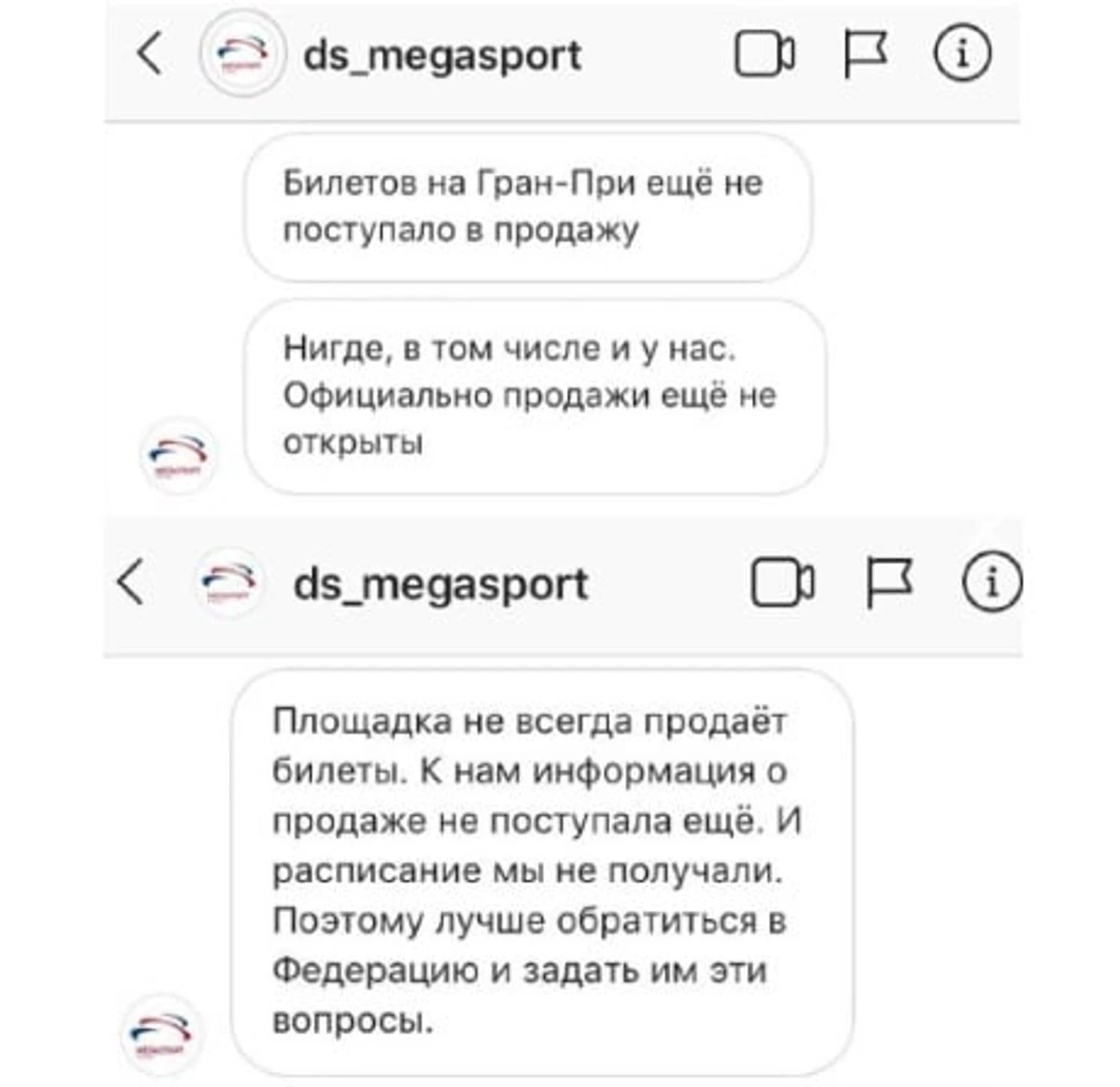 «Билеты на Гран-при еще не поступали в продажу. Нигде, в том числе и у нас. Официально продажи еще не открыты», – ответили представители «Мегаспорта» болельщику.